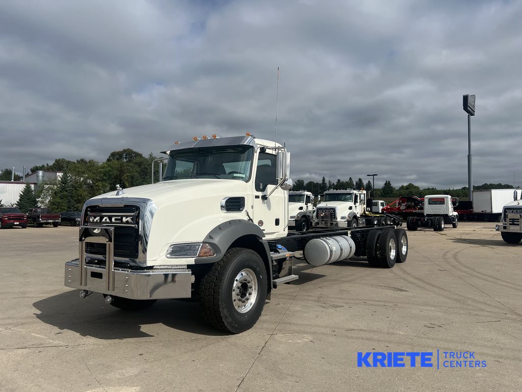 2026 Mack Granite GR64B- storm truck chassis. Powered by a Mack MP8 with 505 HP and Mack mDrive 12 speed transmission. 20k front axle and Meritor 46k rear axle with Hendrickson 46k air ride suspension. 304” wheel base, 3.42 ratio and full lockers and power divider.