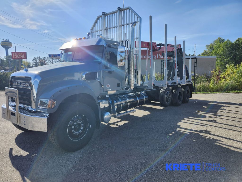 2026 Mack GR84F Logging Chassis w/ 505hp MP8 and an 18spd Eaton Fuller Manual Transmission. 425/65r22.5 steers and a 13K Hendrickson Steerable Pusher Axle. Palfinger Epsilon M13A Loader, Heiden Grapple, Great Lakes Raptor Bunk System w/ Headache Rack and Rear Pintle Plate.